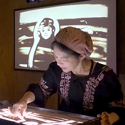 ※サンドアートパフォーマンス…バックライトで照らされたガラス板上で砂の濃淡を用いて次々と絵を変化させていき、それをスクリーンに投影する動的な砂絵のパフォーマンスアート。